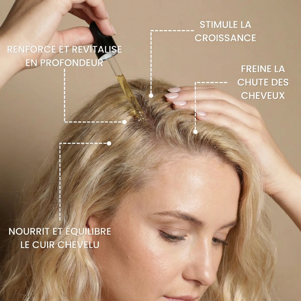 Divisez vos cheveux en sections, appliquez les gouttes directement sur le cuir chevelu et massez en mouvements circulaires pour favoriser la microcirculation et l'absorption.
